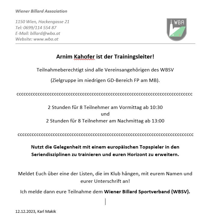 Darum rufe ich alle Dreiband-Begeisterten der WBA, der Union und von Favoriten auf, am Vorbereitungsturnier teilzunehmen, um in Bestform zu starten ;-))